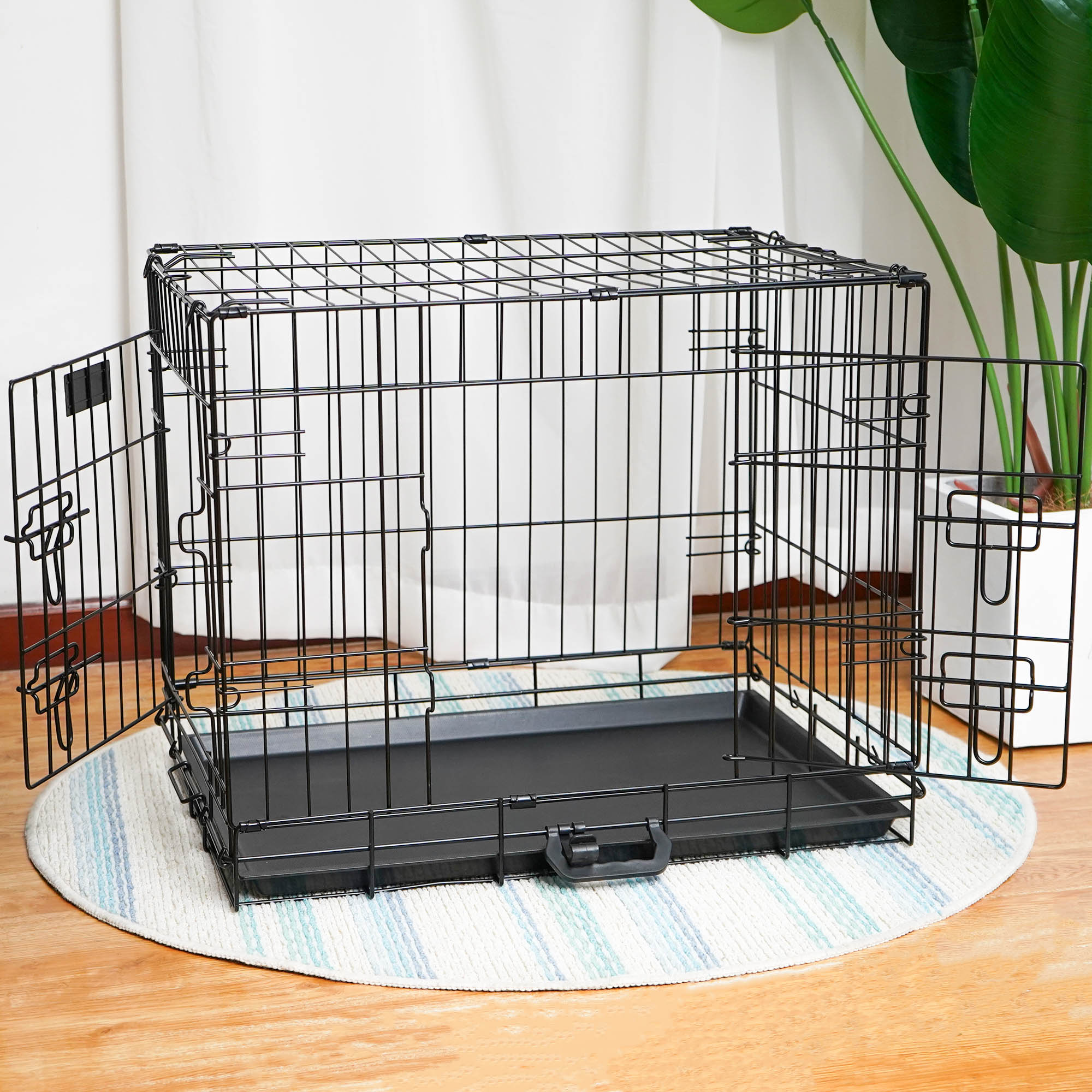 🐶【Safe Crate】Our dog crate features dual entry points: a side door and a front door, both designed for ease of access. Each door is equipped with two heavy-duty slide-bolt latches, ensuring a secure lock to safely contain your pet inside. Additionally, the trays included in our dog cage are crafted from ABS material, which is non-toxic, enhancing the safety and well-being of your pet.