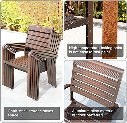 Space Efficiency with Style: Maximizing your patio’s potential, the chairs can be stacked to save space without sacrificing aesthetic appeal. Their design complements the table's modern chic, ensuring that your outdoor setting is always guest-ready with a swift arrangement.