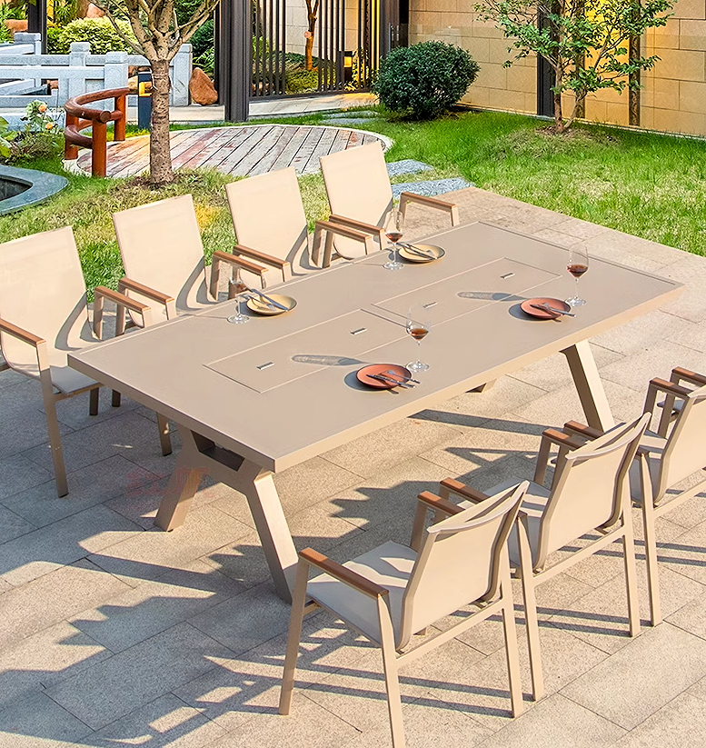 Convertible Grill and Dine Table: Revel in the dual-personality of our table, which seamlessly transitions from an electric/charcoal BBQ hub to a classy dining surface. Embedded with grilling compartments, it caters to your culinary exploits and, when covered, offers a sleek, inviting table for meals and socializing.