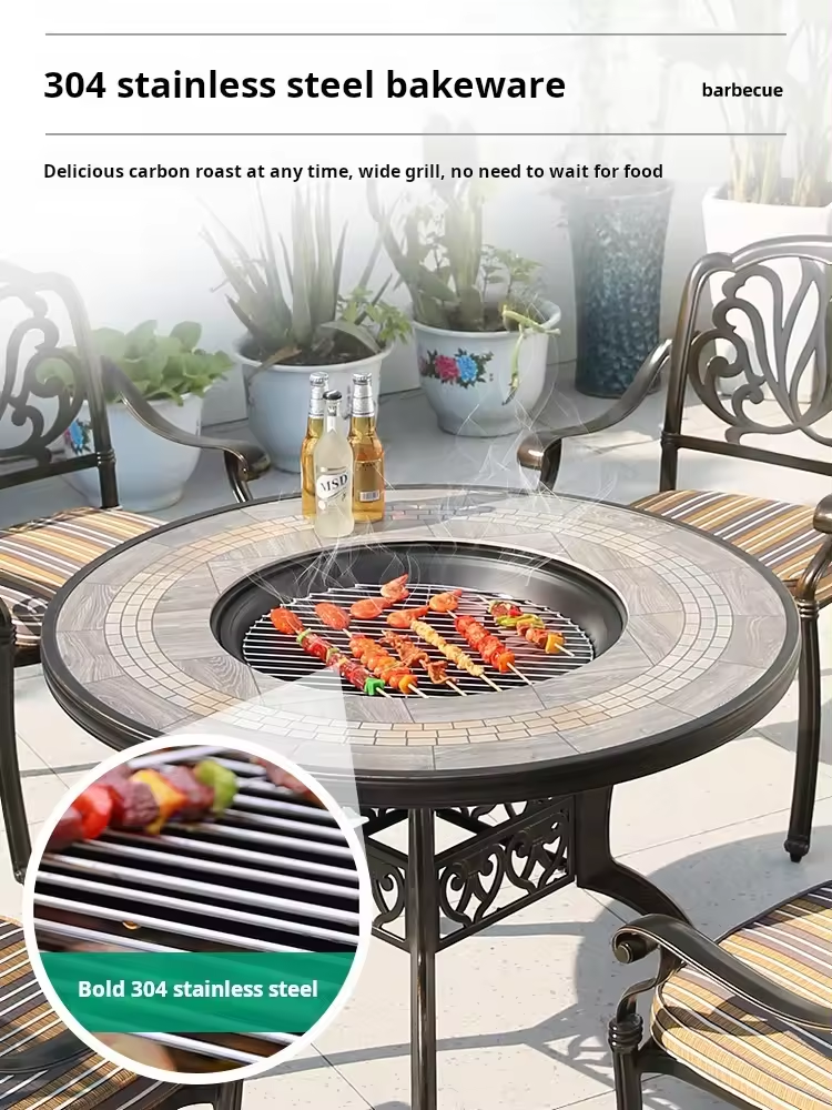 Outdoor Fire Pit 122cm/48 Outdoor Garden Barbecue Table with Wood Burning Fire Pit, Aluminum Party BBQ Table and Chair Set, Multifunctional Dining Table with 4 Chairs